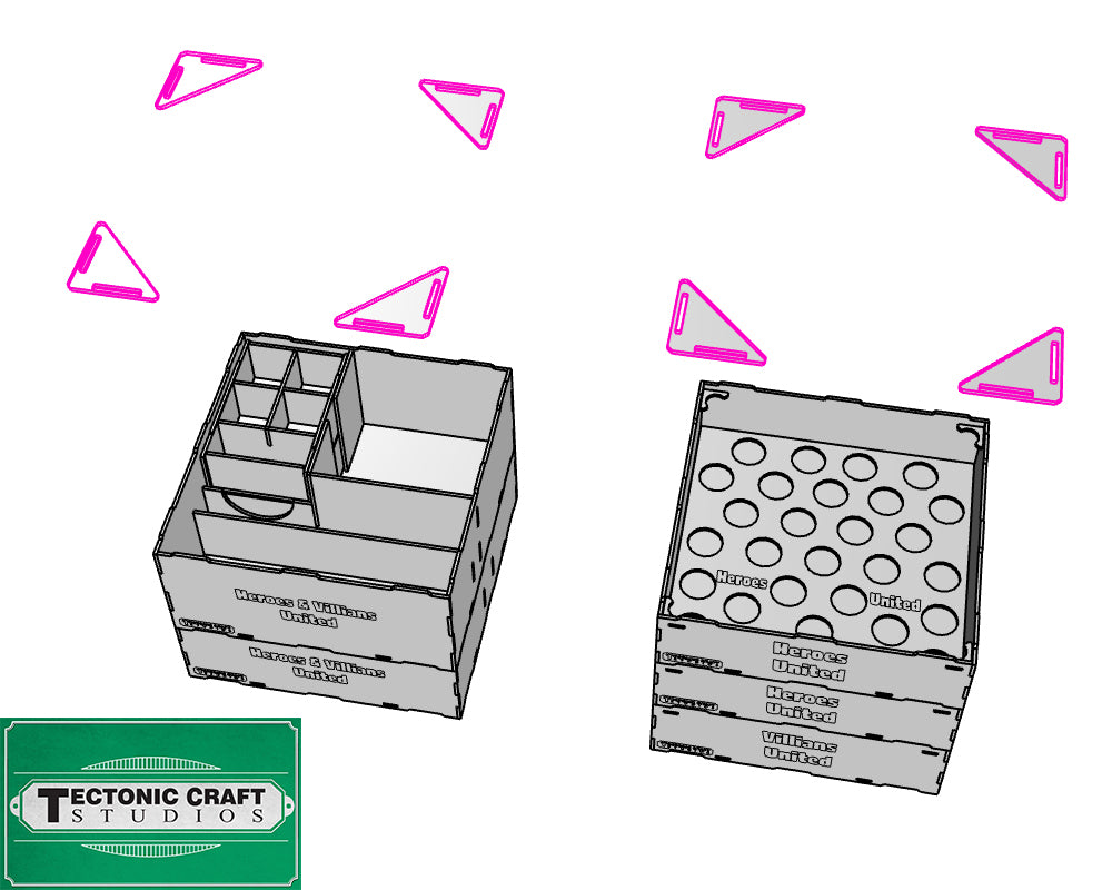 Complete and flexible solutions for your favorite Chibi Superheroes United board game. This stackable storage solution is made to keep all of your game components safe and stored in one place. They are sized to fit inside of the core game and exclusive content boxes and also stack with each other in any order. Components include alphabetical matching tab and slot assembly keys (Tab A into Slot A, etc)