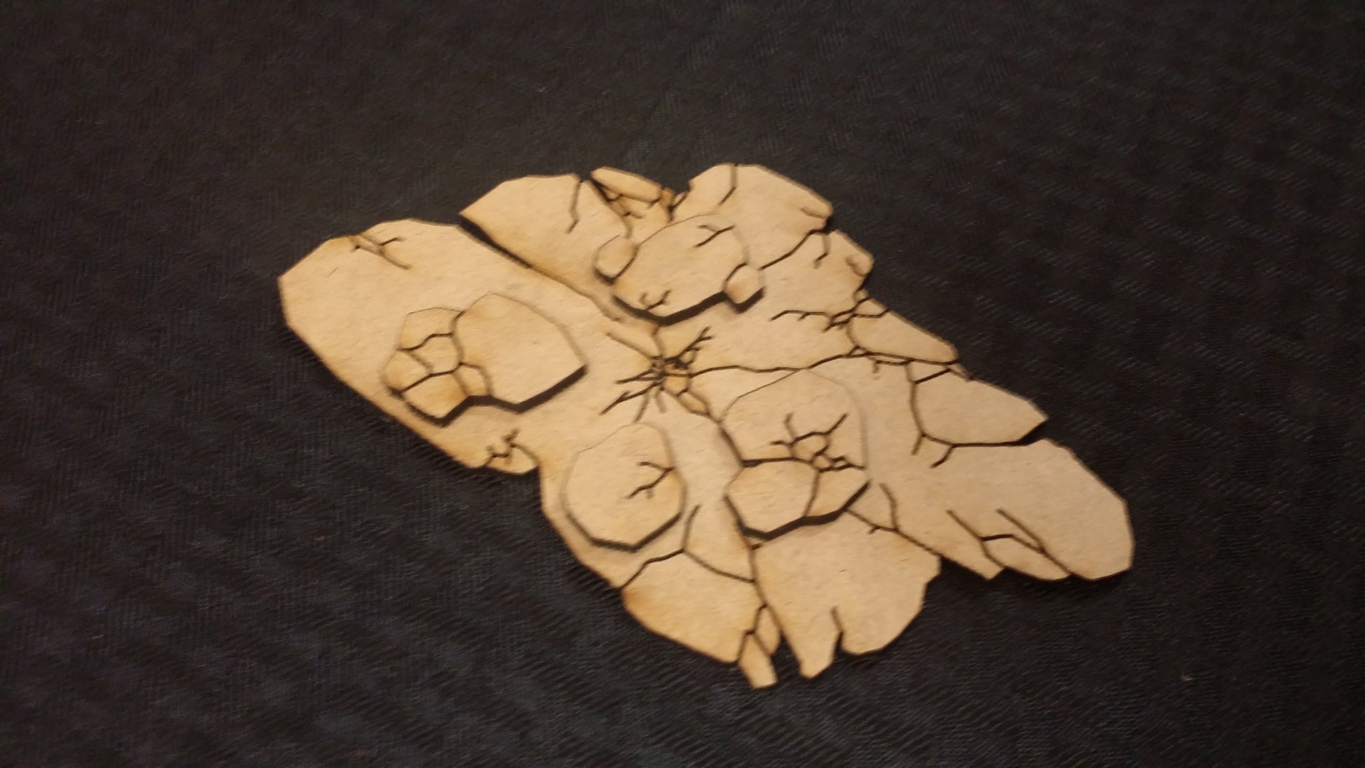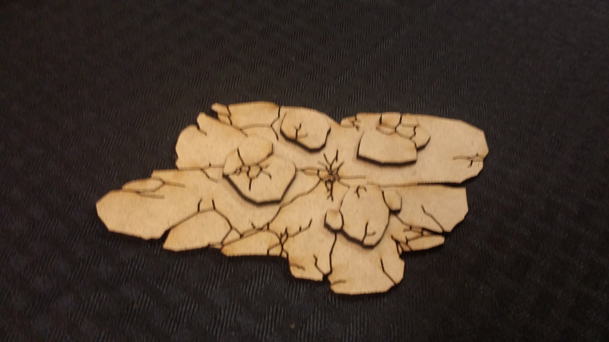 This basic rough ground template is sized to work for battles in the Kingdoms of Iron and the Free cities. It is made with the hobbyist in mind for easy painting/basing and incorporation into your skirmish battlefield or fantasy soccer pitch.